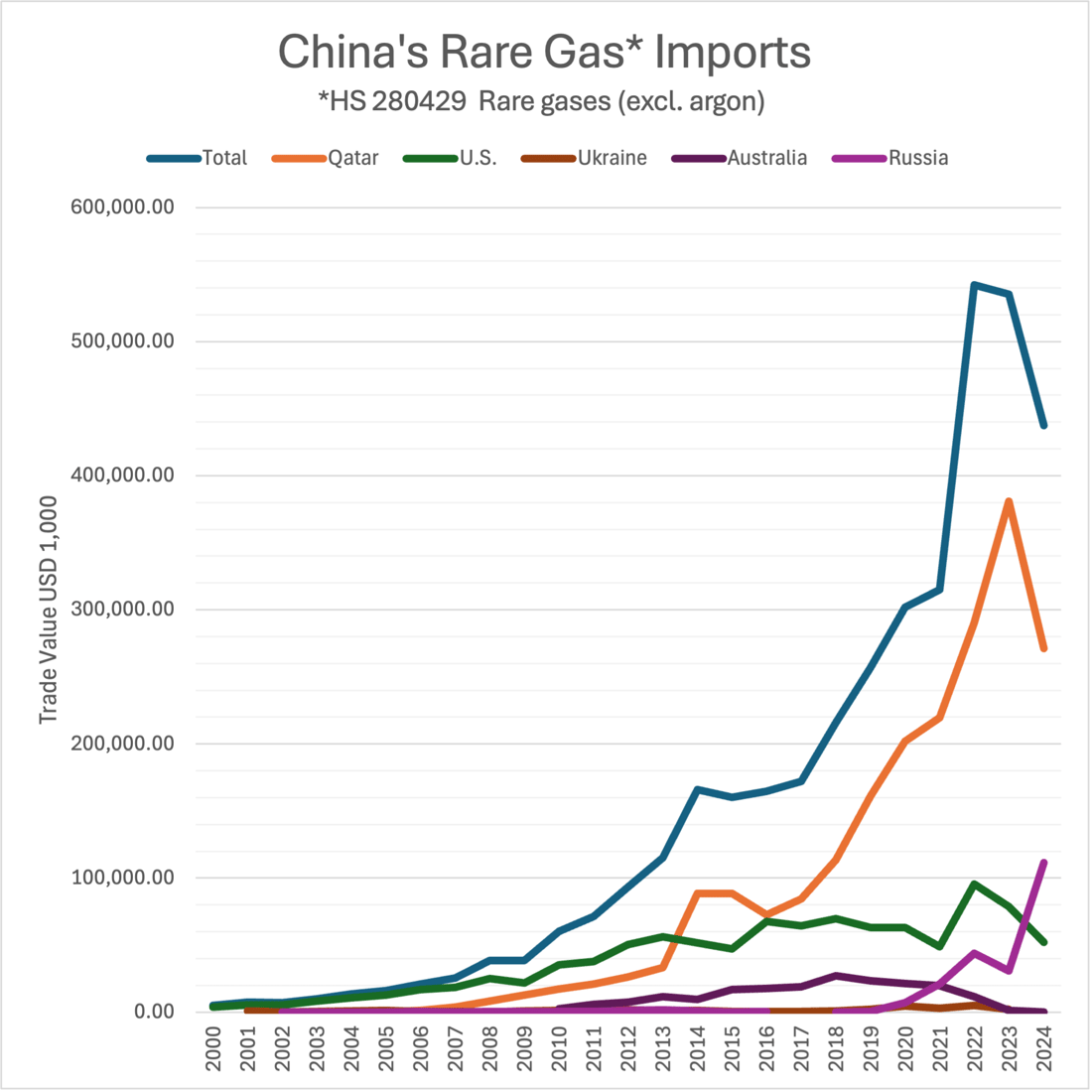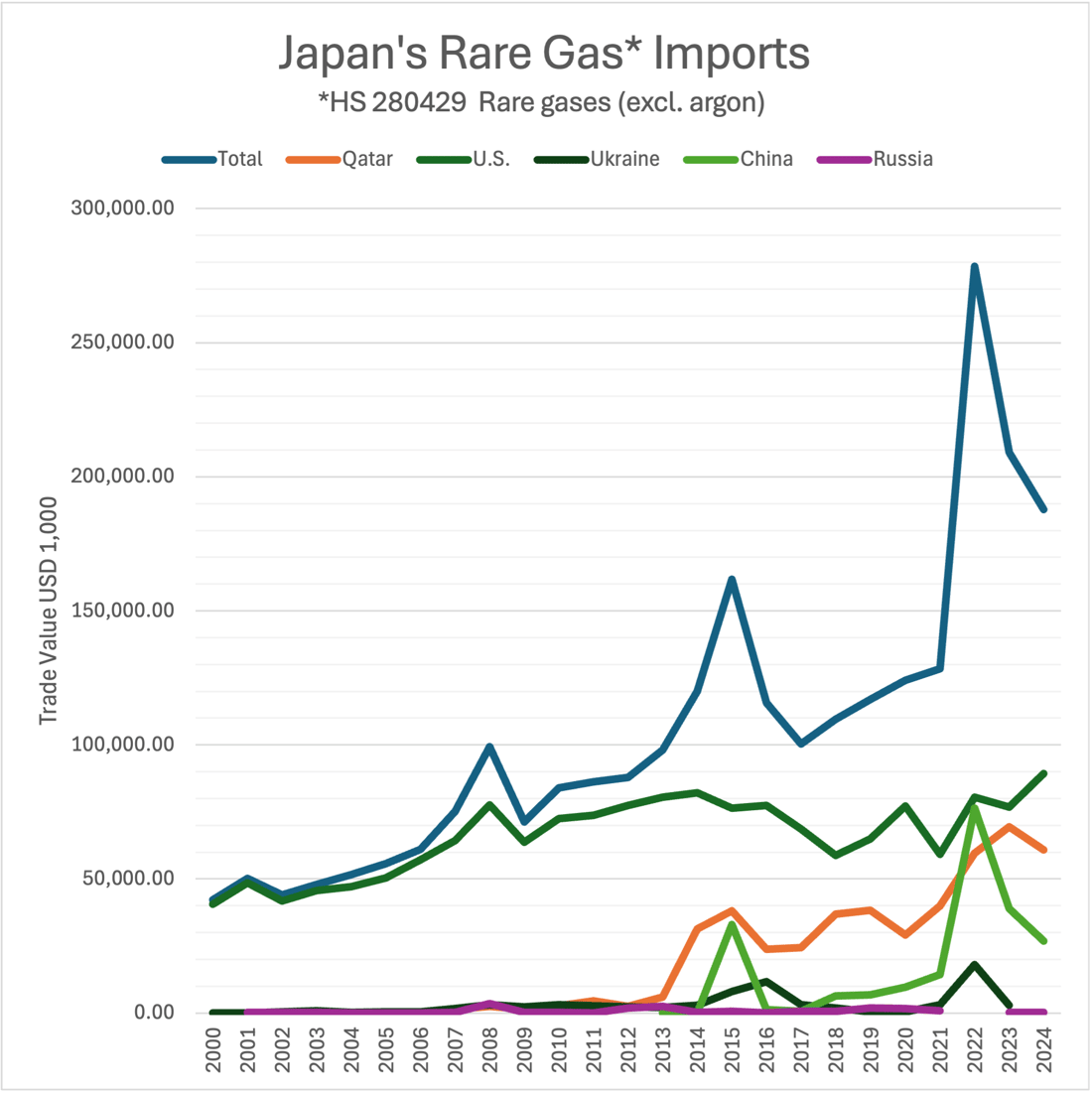 The entrance of Qatar into the global rare gas supply market allowed South Korea to start to reduce its heavy dependence on the United States by around 2020. South Korea’s response to the 2022 Russian invasion of Ukraine was a massive surge in imports to stockpile - an oversized reaction triggered by South Korea’s challenges faced in the 2014 Russian annexation of Crimea and in their 2019 spat with Japan, where Tokyo limited critical gas exports to South Korea. South Korea has also undertaken significant investment in the domestic production of rare gases, and in the capture and recycling of gasses at semiconductor facilities.