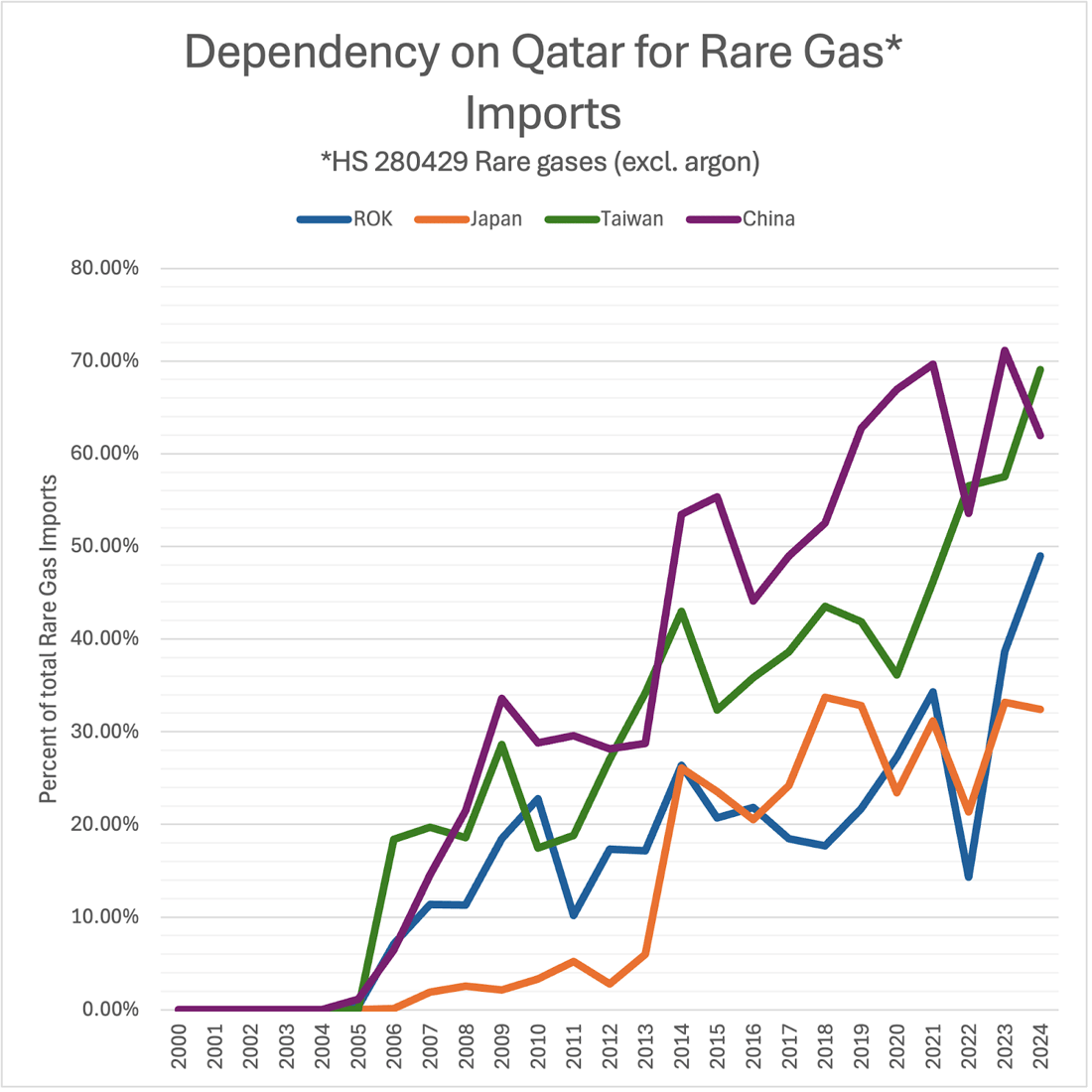 Taiwan is slightly harder to suss out, as it is not formally included in WITS data (but rather falls under the euphemistic category “Other Asia - nes (not elsewhere seen).” Taiwan’s dependency on Qatar for rare gases rises dramatically, with Qatar supplying just over 69 percent of Taiwan’s total imports of rare gases in 2024, compared to Japan’s 32 percent and South Korea’s 49 percent dependency, suggesting Taiwan is the most exposed of the northeast Asian countries currently, Japan the least.